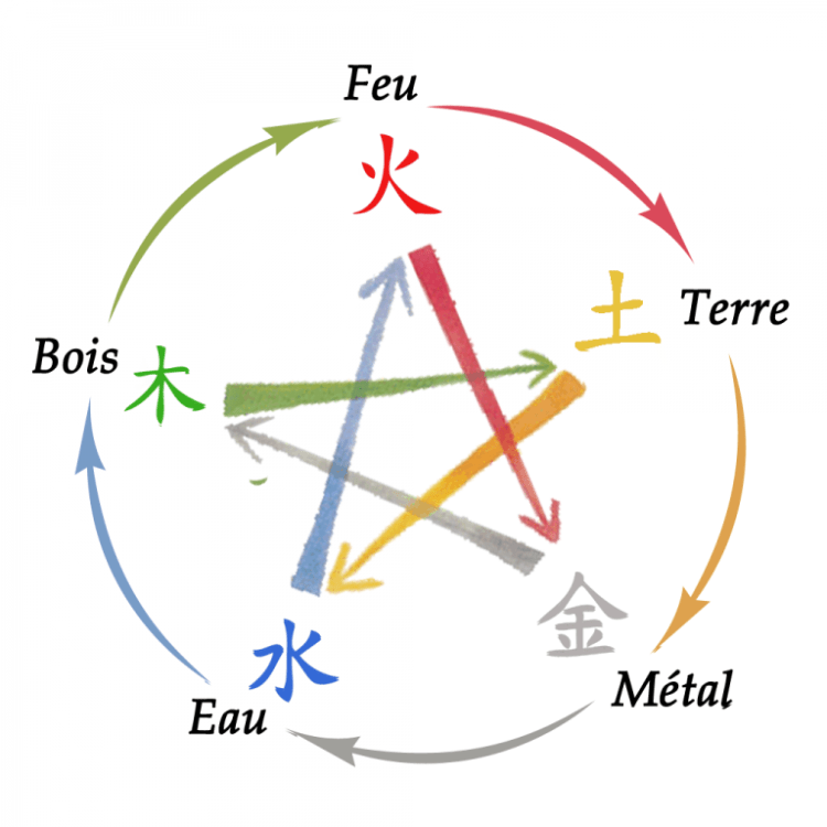 Le Bois, le Feu, la Terre, le Métal et l’Eau. Chaque élément est associé à des organes spécifiques, des saisons, des émotions. Ils sont considérés comme étant en interaction dynamique et en équilibre constant. Ils sont utilisés pour évaluer et traiter les déséquilibres énergétiques dans le corps humain.